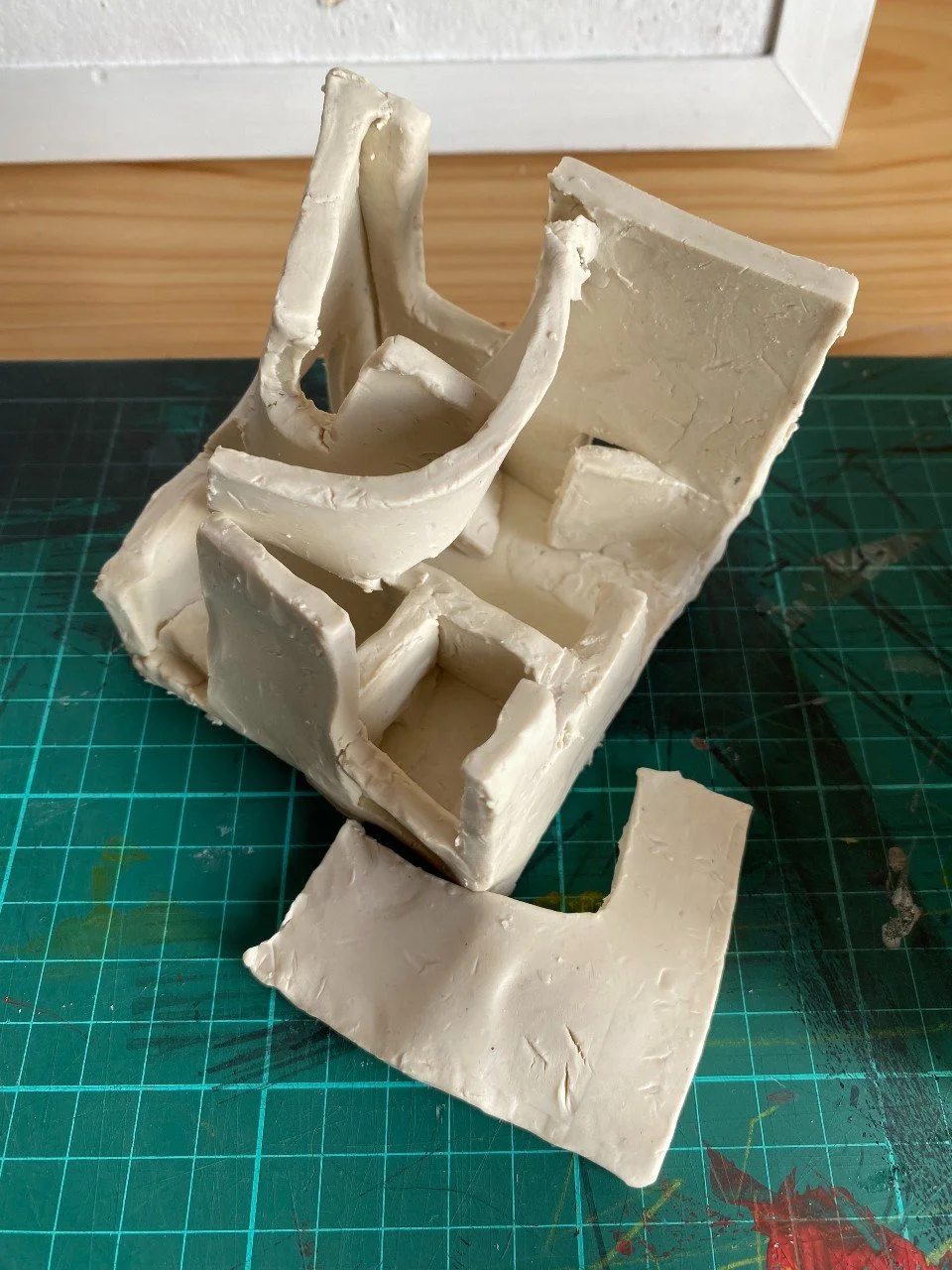 I'm interested in the transformation of two-dimensional shapes into three-dimensional objects. I collect folded bits of packaging - those discarded bits of cardboard fitting snugly around a cup or pair of shoes or a phone - and unfold them to reveal the underlying shape. I construct my own imagined discarded shapes which with a simple fold become useful sculptures.